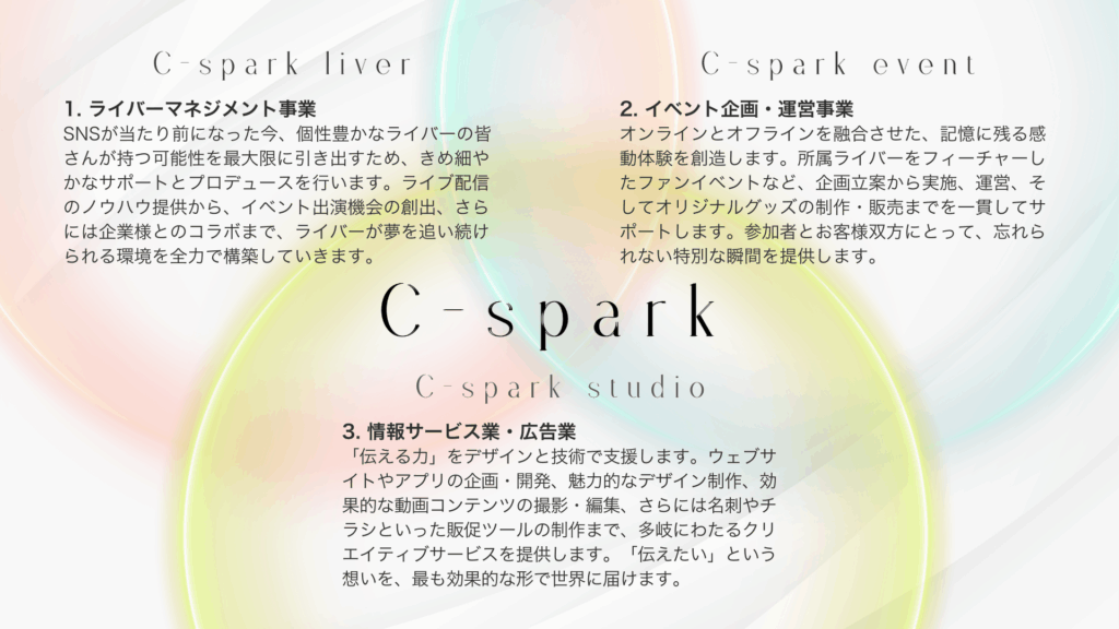 合同会社C-sparkは、以下の3つの柱を中心に事業を展開し、クリエイティブとコミュニケーションの力でお客様のビジネスや夢を支援いたします。